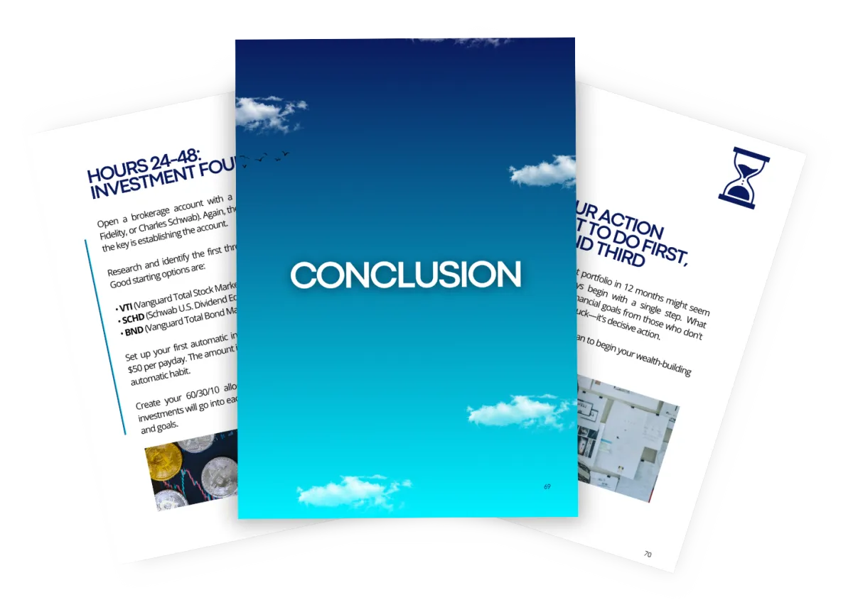 You'll receive the complete digital guide that covers all of the knowledge you need on investing (Investment Foundation, Real Estate Entry Strategy, Smart Market Investing, and Wealth Automation Framework). Each section provides detailed instructions and formulas you can implement immediately to start building your wealth, just as I did.